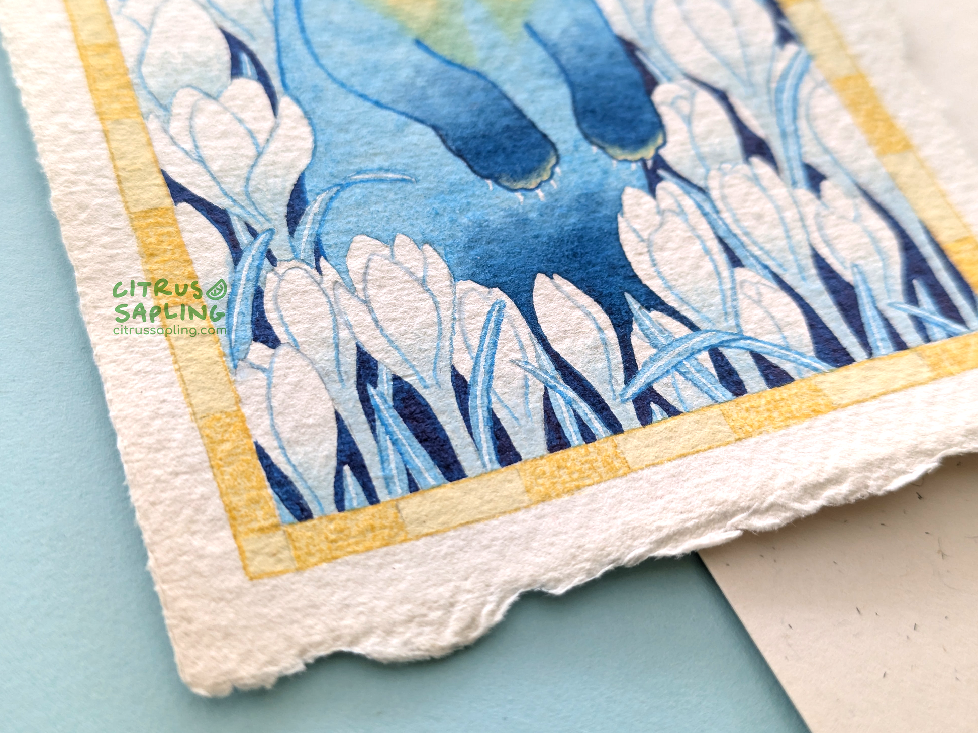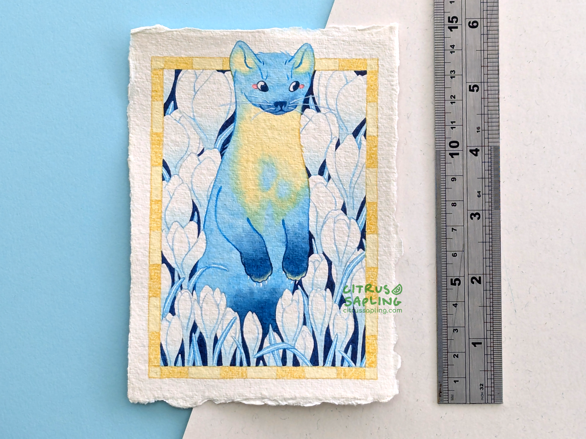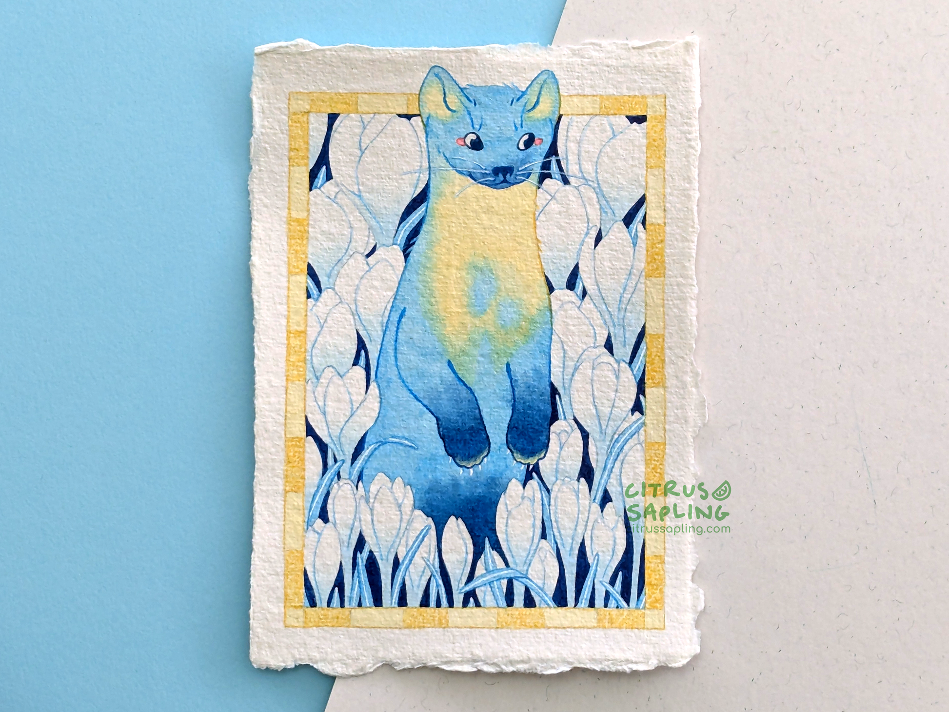 This is an original one-of-a-kind artwork featuring a pine marten among crocus flowers!