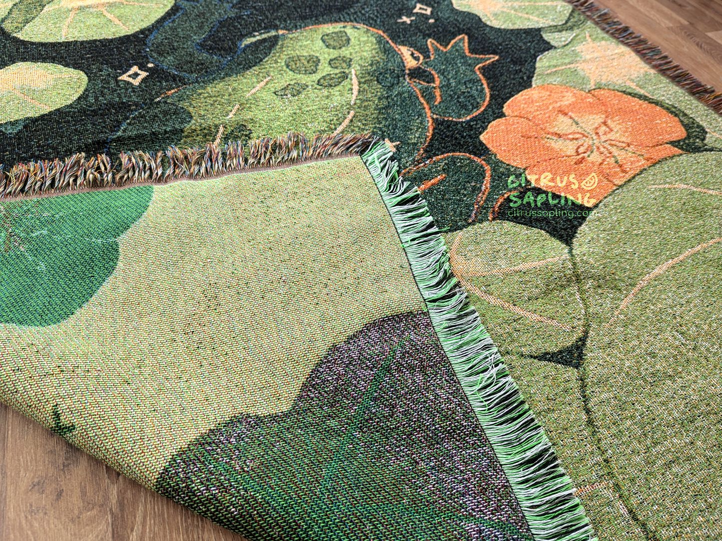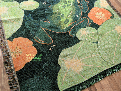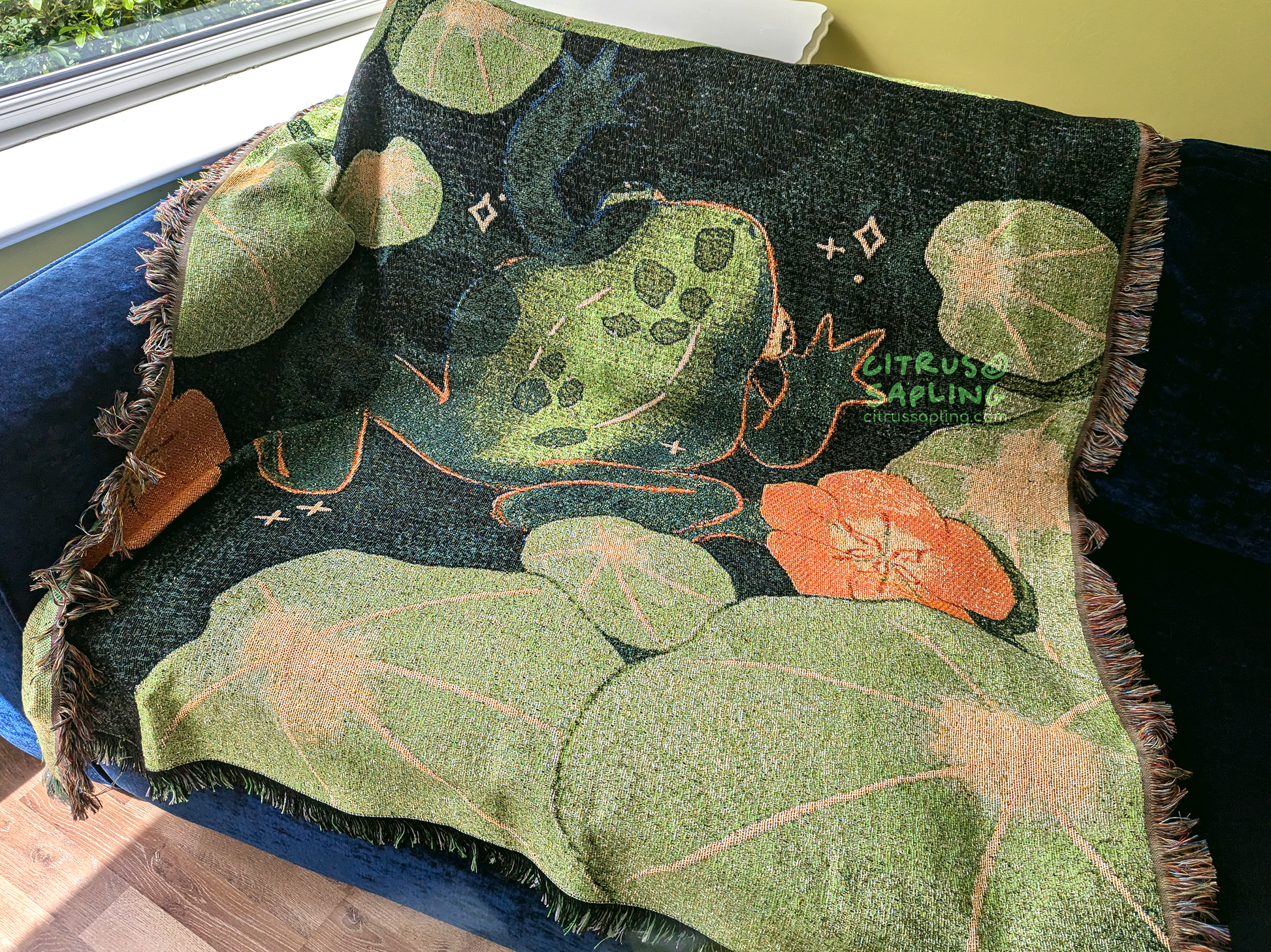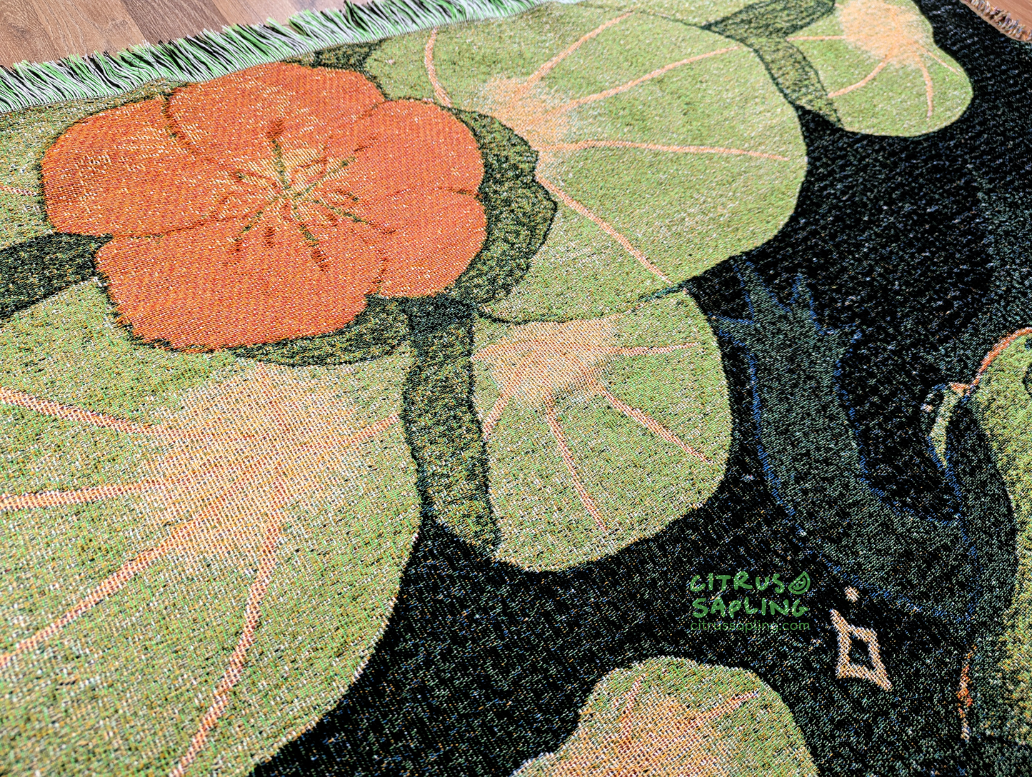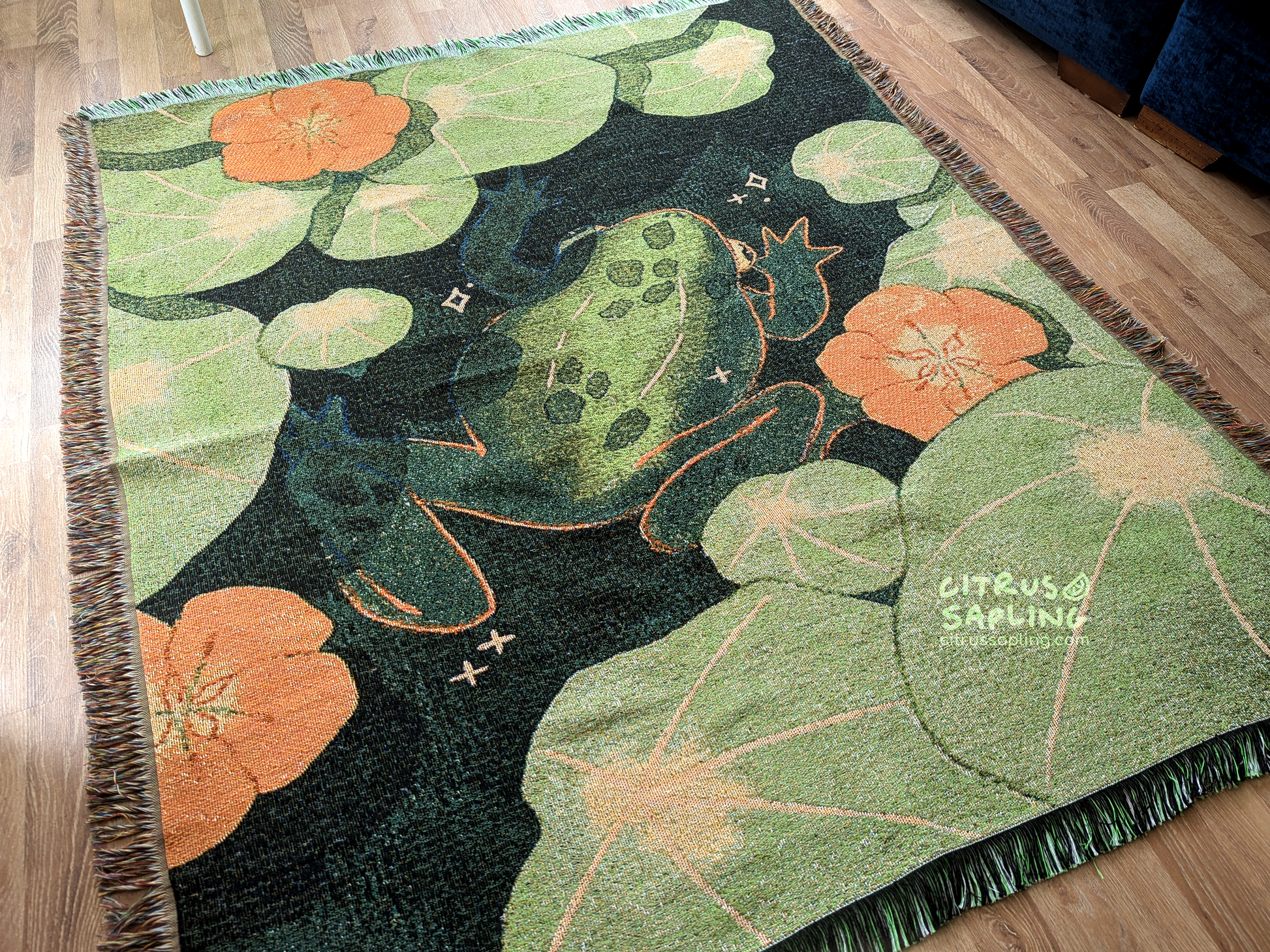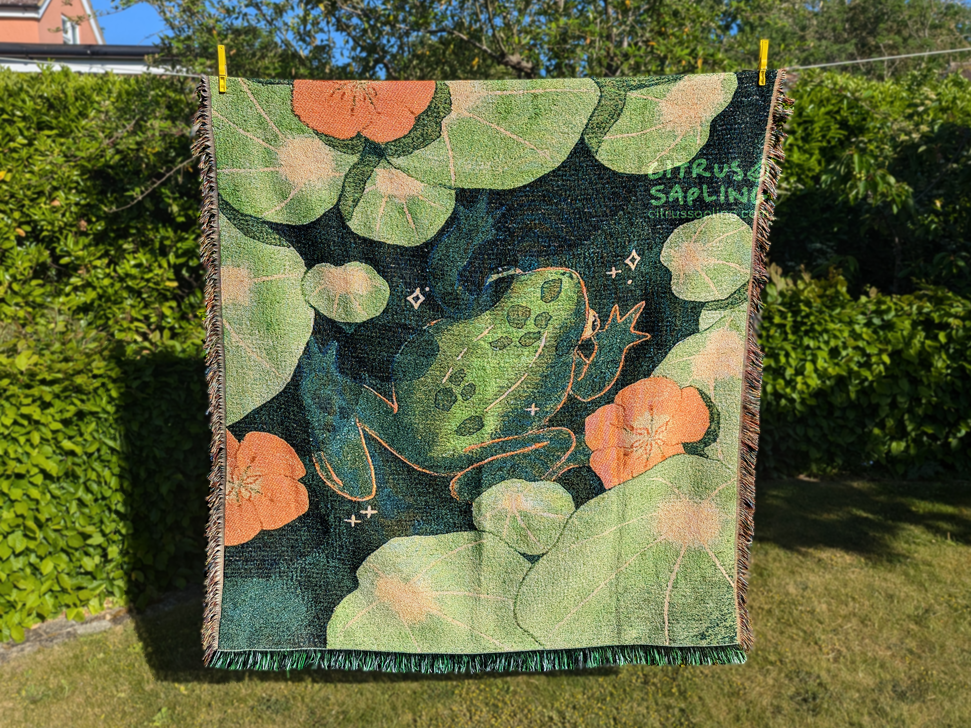 Who doesn't need a big frog for their home décor? 🐸 These tapestry throw blankets have been beautifully woven on a jacquard loom, a weaving process that captures the original watercolour texture of my painting. Other than blankets for beds or throws for sofas, these can also be used as rugs (indoor or take it on a picnic), table cloths, or as wall tapestries!